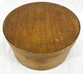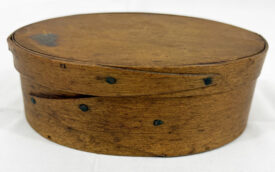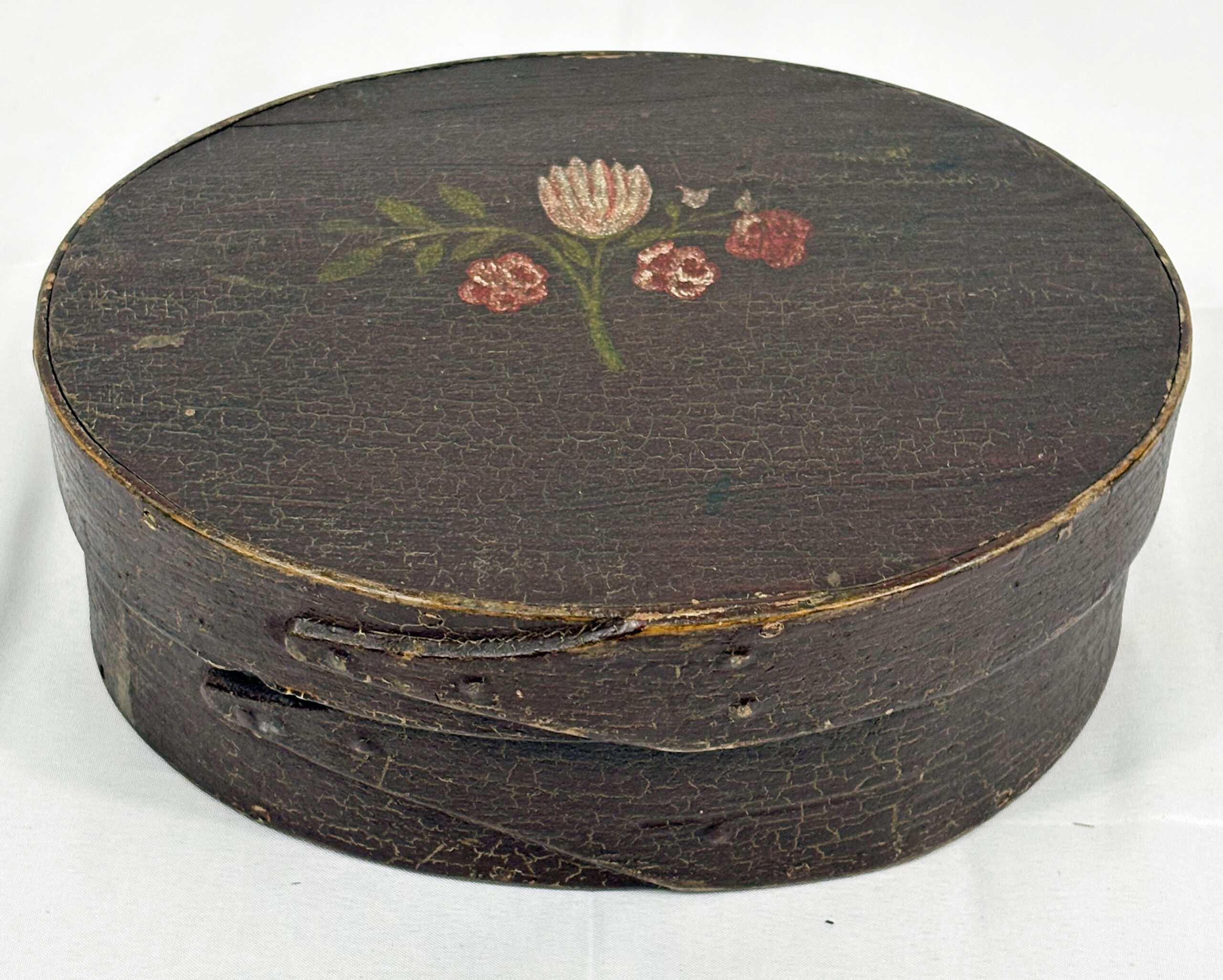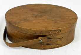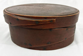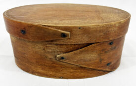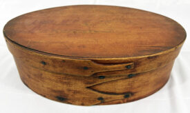 Early pantry box with lid; Oval; Two finger construction; Original, alligatored reddish brown surface; floral motif; Possible Owner’s initials and 1786 date on bottom; 8″ x 6 3/8″ x 2 13/16″; $375