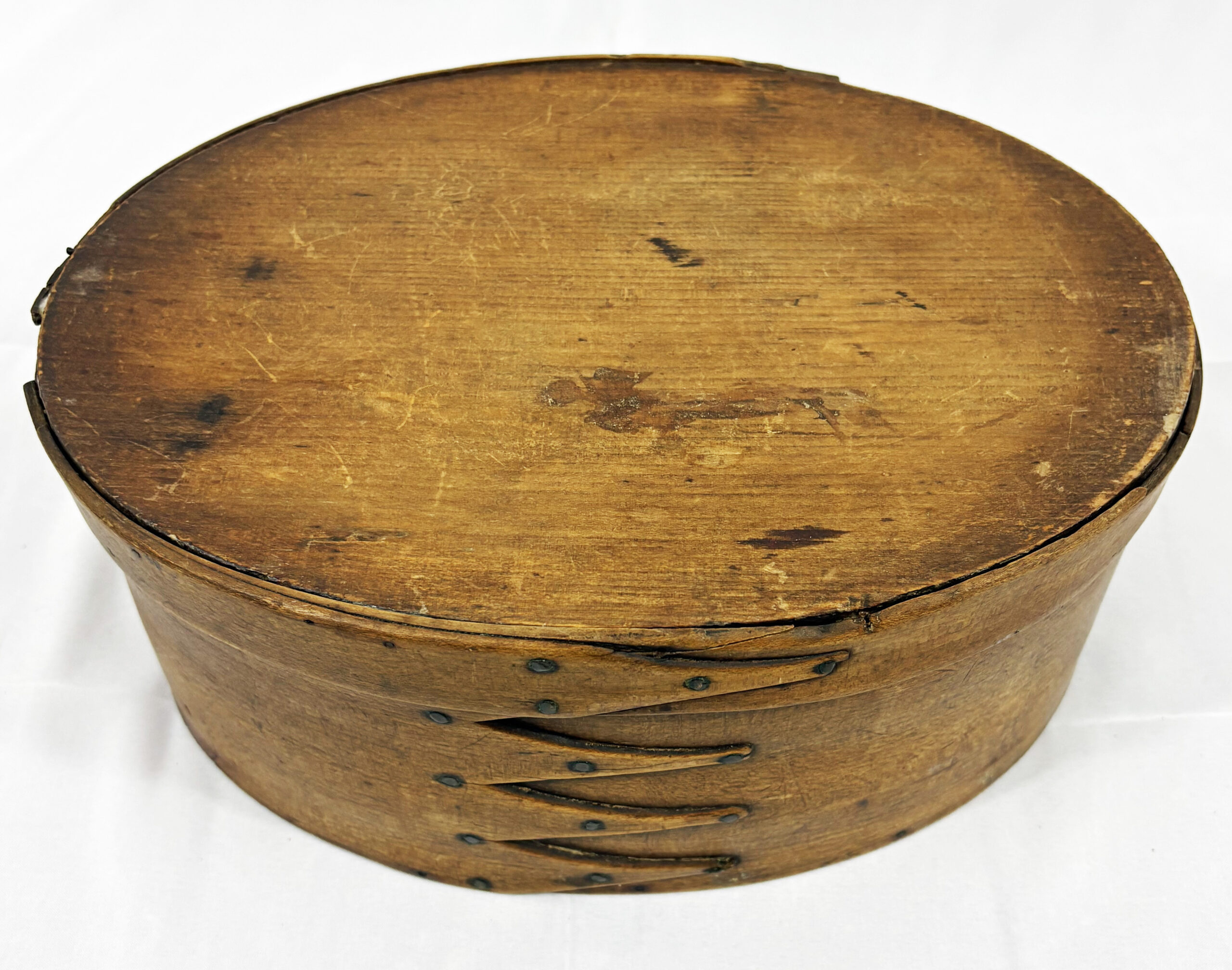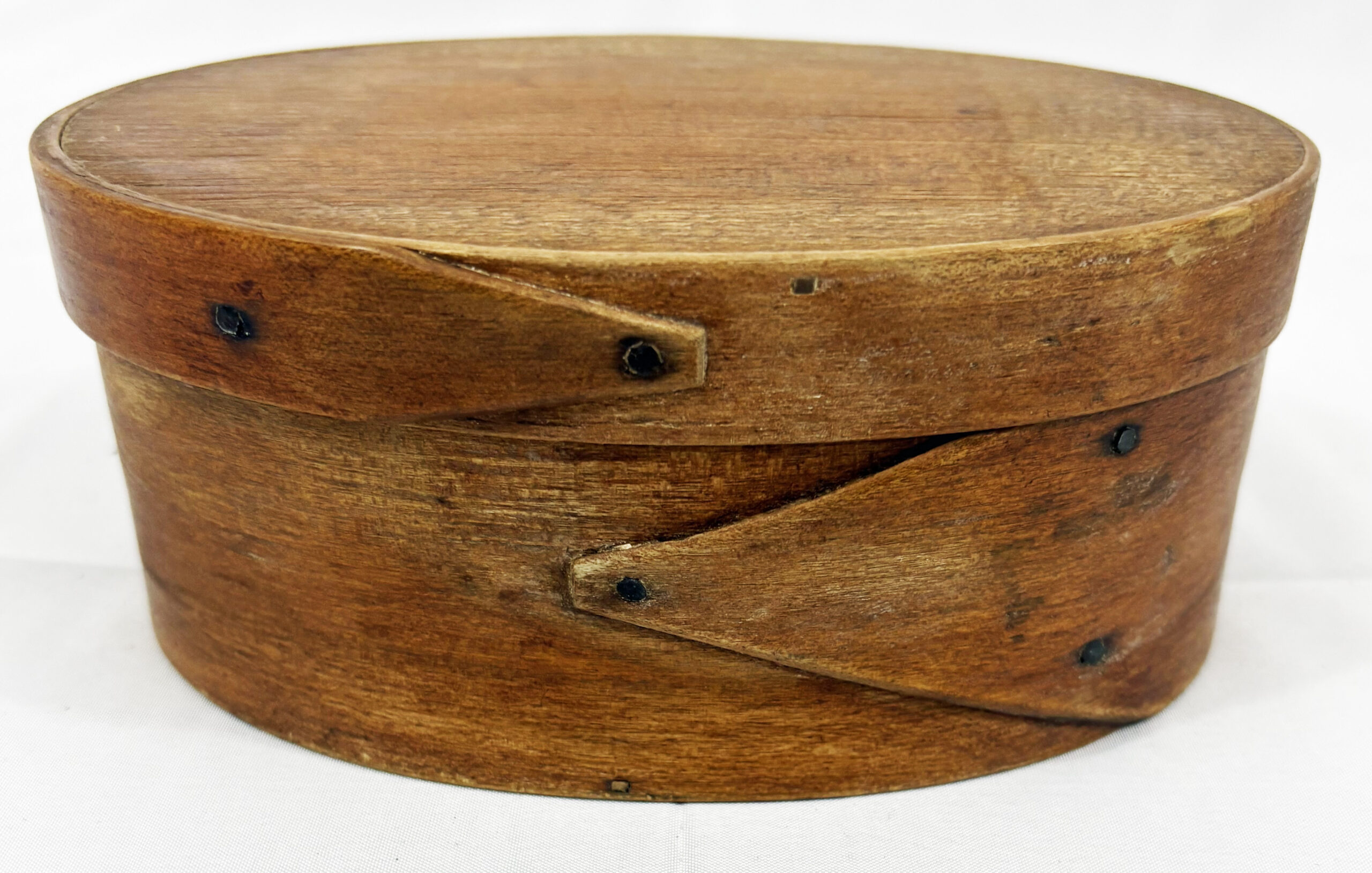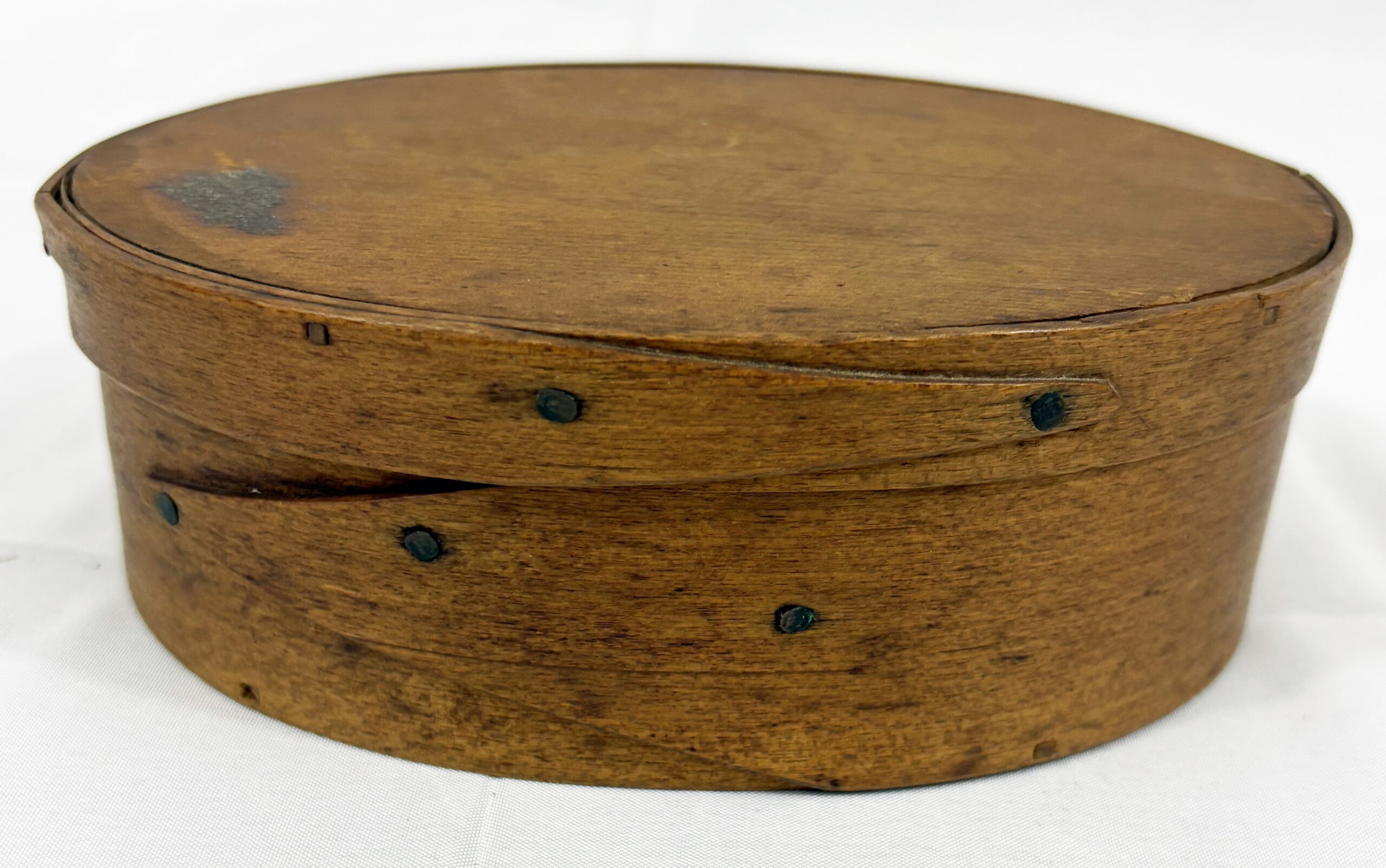 Bentwood pantry box with lid; Oval; Three finger construction; Minor age shrinkage in bottom board resulting in minor separation from outside band13 1/8″ x 8 3/4″ x 4 1/8″; $450