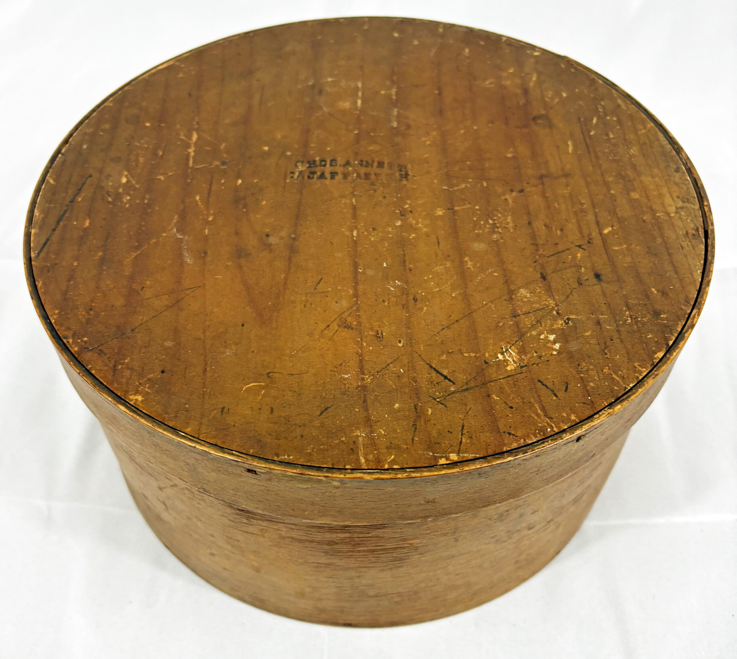 Bentwood pantry box with lid; Round; Lapped construction; Signed Thomas Annett, E.  Jaffrey, N. H.; $195