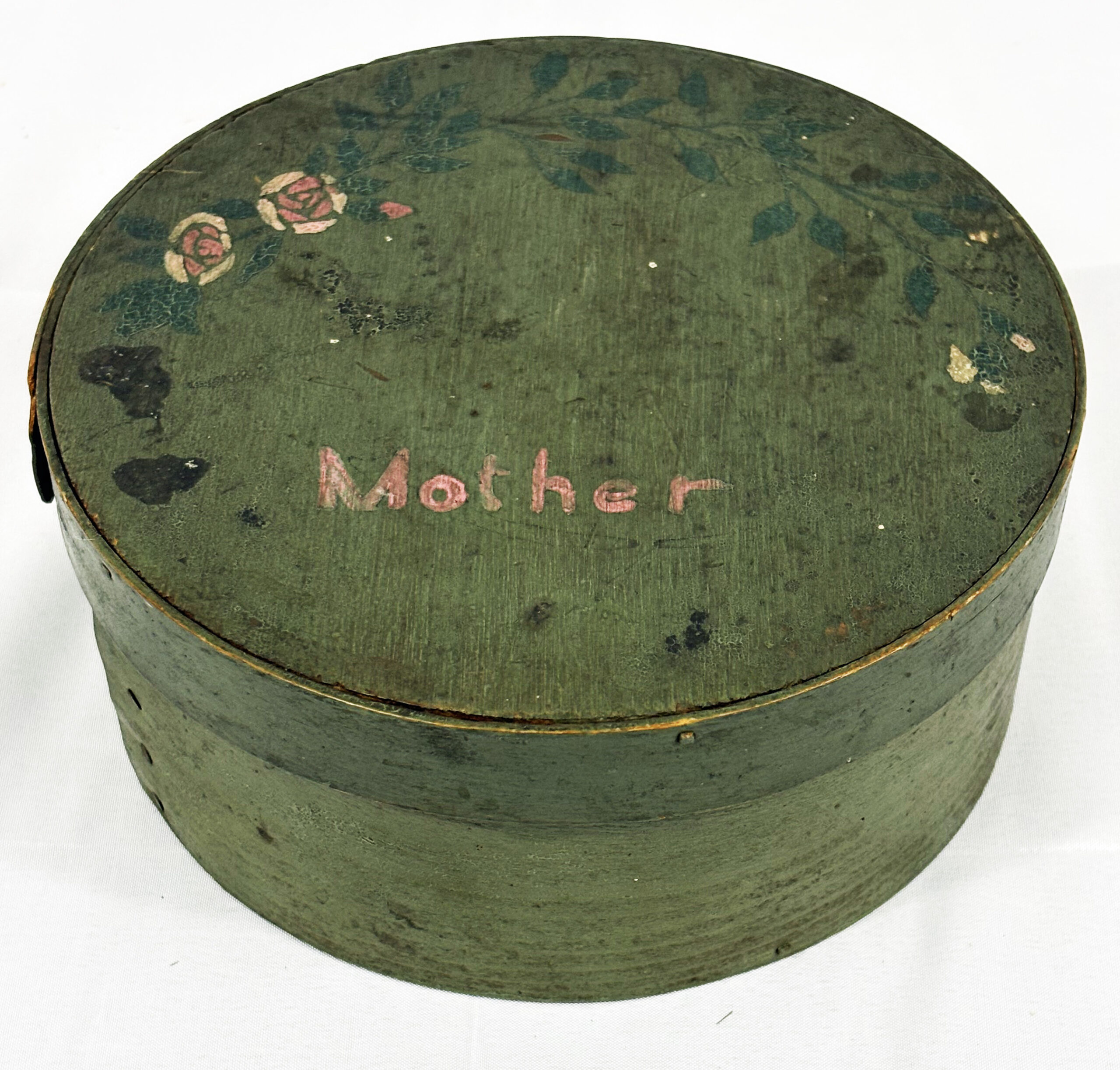 Painted Pantry Box; Lapped Construction; Green exterior with flower and leaf accents; Green interior; Probably made for the maker’s mother; 6 1/2″ in diameter x 2 13/16″ high; $165